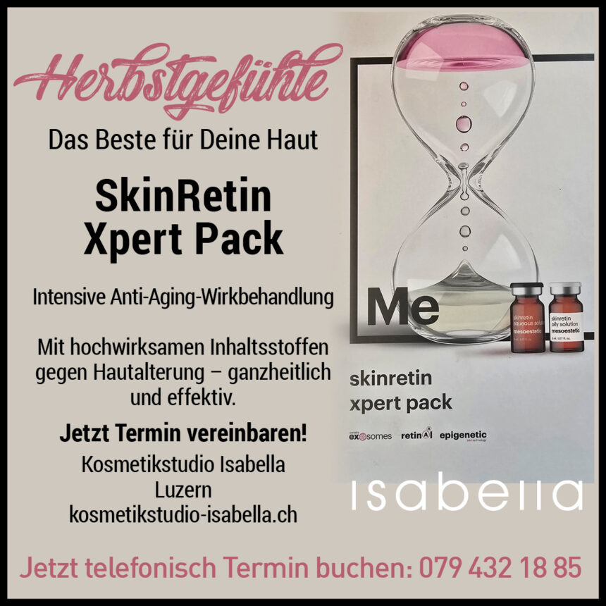 Nach einem intensiven, aber wunderschönen Sommer braucht Deine Haut jetzt eine regenerative, ganzheitliche Gesichtsbehandlung. Kosmetikstudio Isabella empfiehlt: Starte in den Herbst mit der einzigartigen SkinRetin Xpert Pack Anti-Aging-Wirkbehandlung. Diese exklusive Behandlung vereint neueste Erkenntnisse aus der regenerativen Medizin mit hochwirksamen Inhaltsstoffen der neuesten Generation, um die Hautalterung ganzheitlich und effektiv zu bekämpfen. Durch fortschrittliche Technologien aus der Epigenetik und Exosomen-Forschung, kombiniert mit Retinol und seinen Derivaten, werden bereits ab der ersten Sitzung sichtbare und langanhaltende Ergebnisse erzielt.